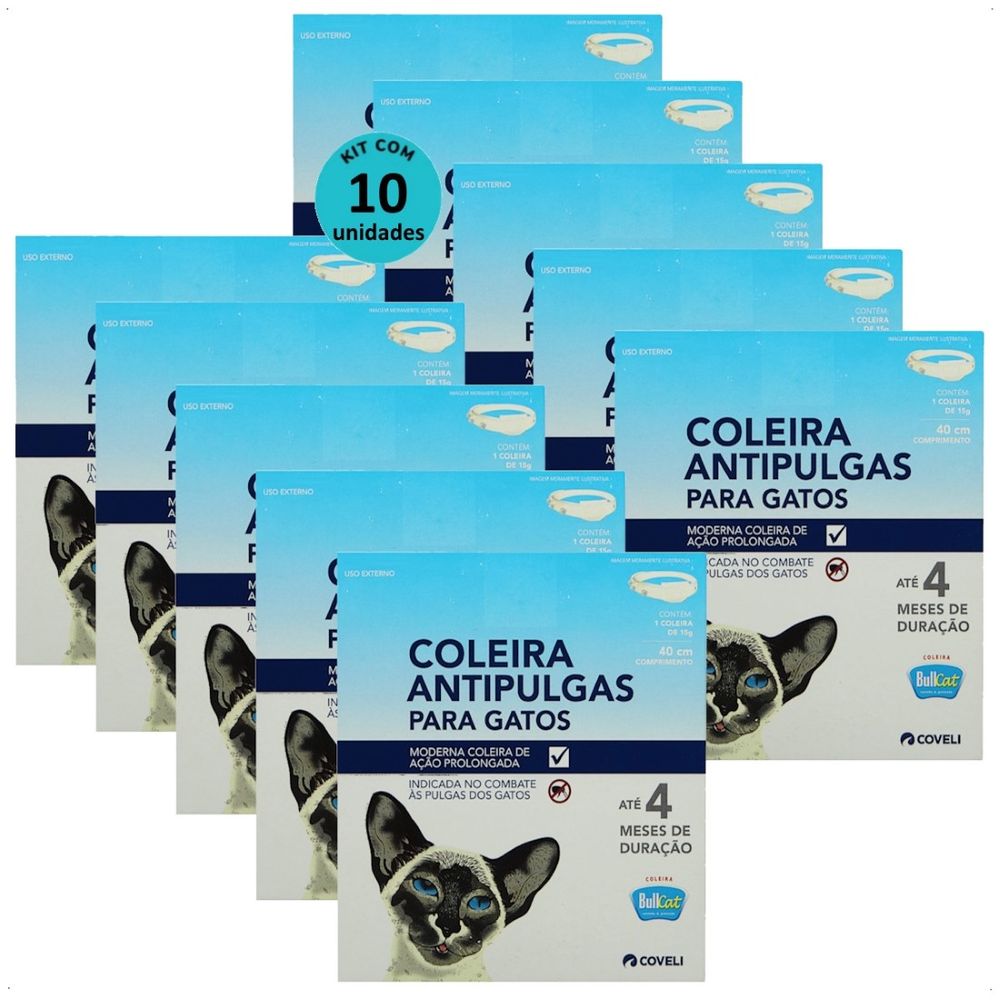 COLEIRA ANTIPULGAS BULLCAT PARA GATOS 40CM E 15G COVELI KIT COM 10