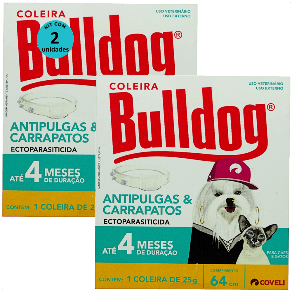 COLEIRA ANTIPULGAS E CARRAPATOS BULLDOG 4 COM 64CM E 25G PARA CÃES E GATOS COVELI KIT COM 2