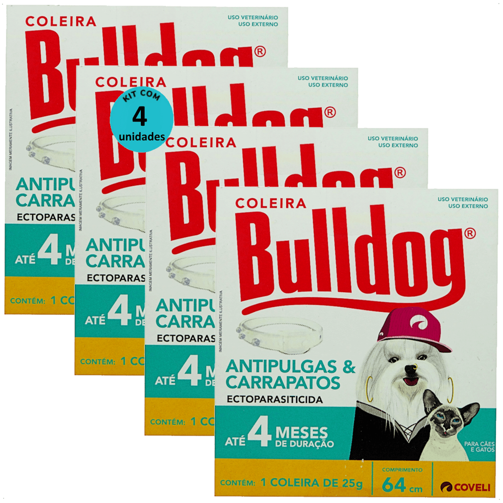 COLEIRA ANTIPULGAS E CARRAPATOS BULLDOG 4 COM 64CM E 25G PARA CÃES E GATOS COVELI KIT COM 4