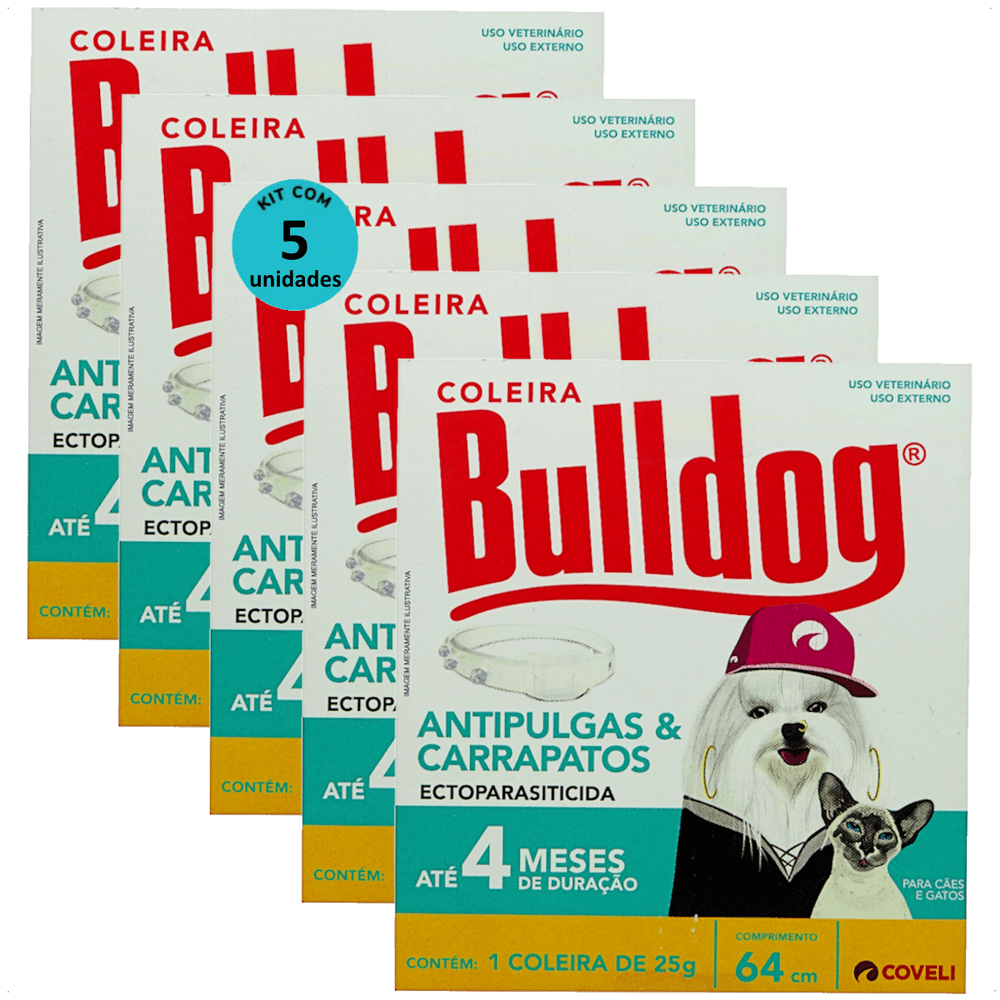 COLEIRA ANTIPULGAS E CARRAPATOS BULLDOG 4 COM 64CM E 25G PARA CÃES E GATOS COVELI KIT COM 5