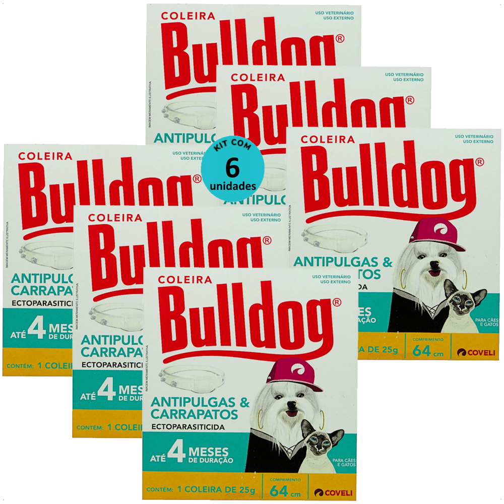 COLEIRA ANTIPULGAS E CARRAPATOS BULLDOG 4 COM 64CM E 25G PARA CÃES E GATOS COVELI KIT COM 6