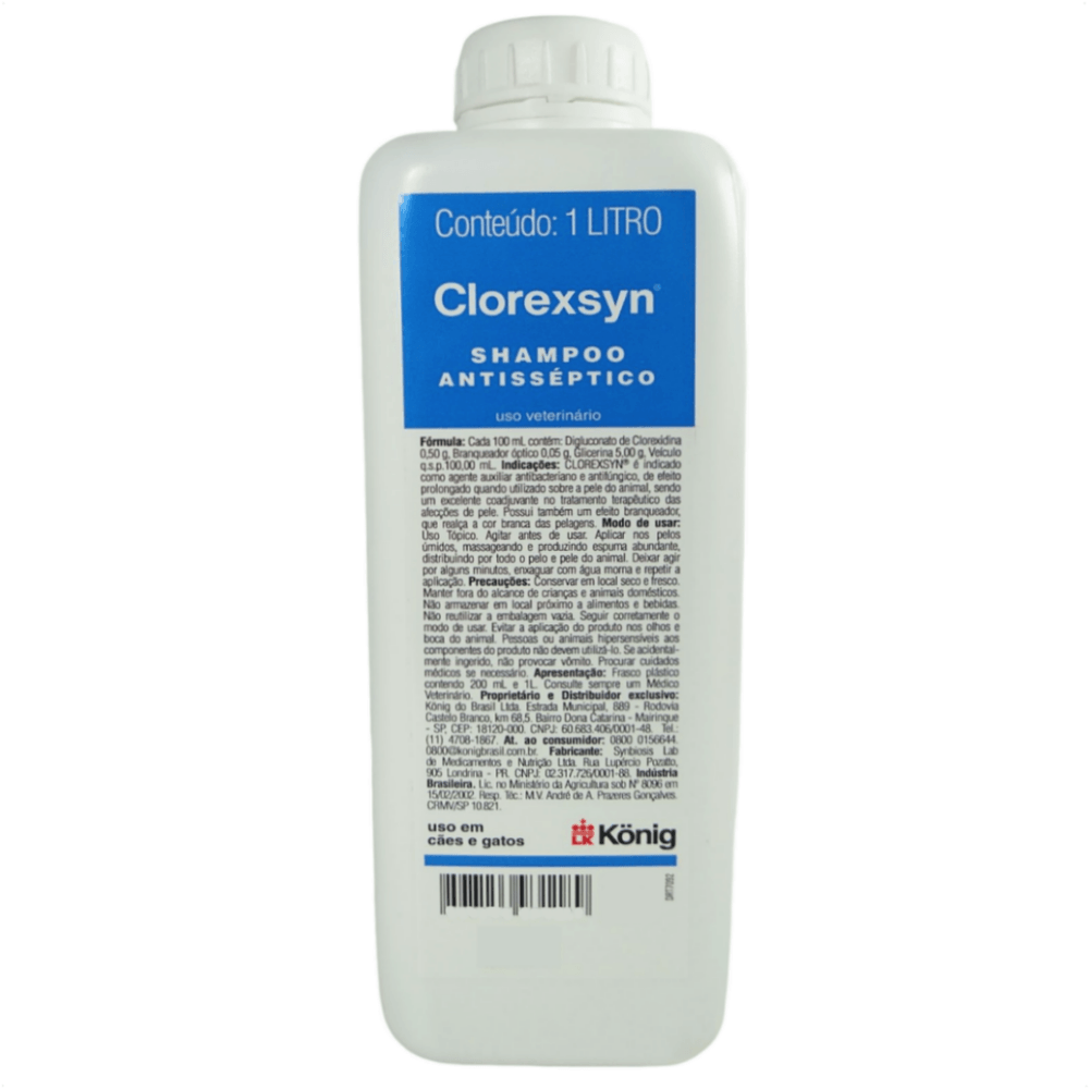 Shampoo Antisséptico Clorexsyn de ação antisséptica e desinfetante que auxilia na recuperação das piodermites bacterianas e dermatites fúngicas.
